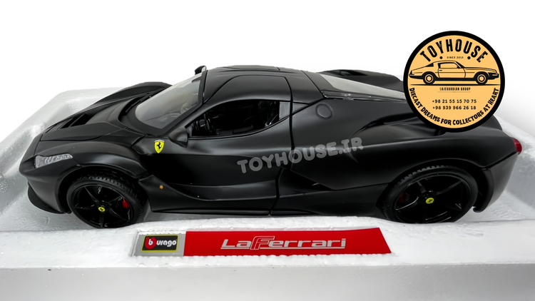 ماکت فلزی Ferrari LaFerrari در مقیاس 1:18 محصول برند معتبر Bburago، یک نمونه کلکسیونی دقیق و جذاب از ابرخودروی مشهور فراری است. این ماکت با جزئیات بالا طراحی شده و از کیفیت بالای ساخت برخوردار است. درهای خودرو، کاپوت و صندوق قابلیت باز شدن دارند و فضای داخلی با دقت خاصی شبیهسازی شده است. رنگ بدنه مشکی مات (Matt Black) همراه با رینگهای اسپرت و لوگوی رسمی Ferrari، جلوهای واقعگرایانه به این مدل میدهد.
